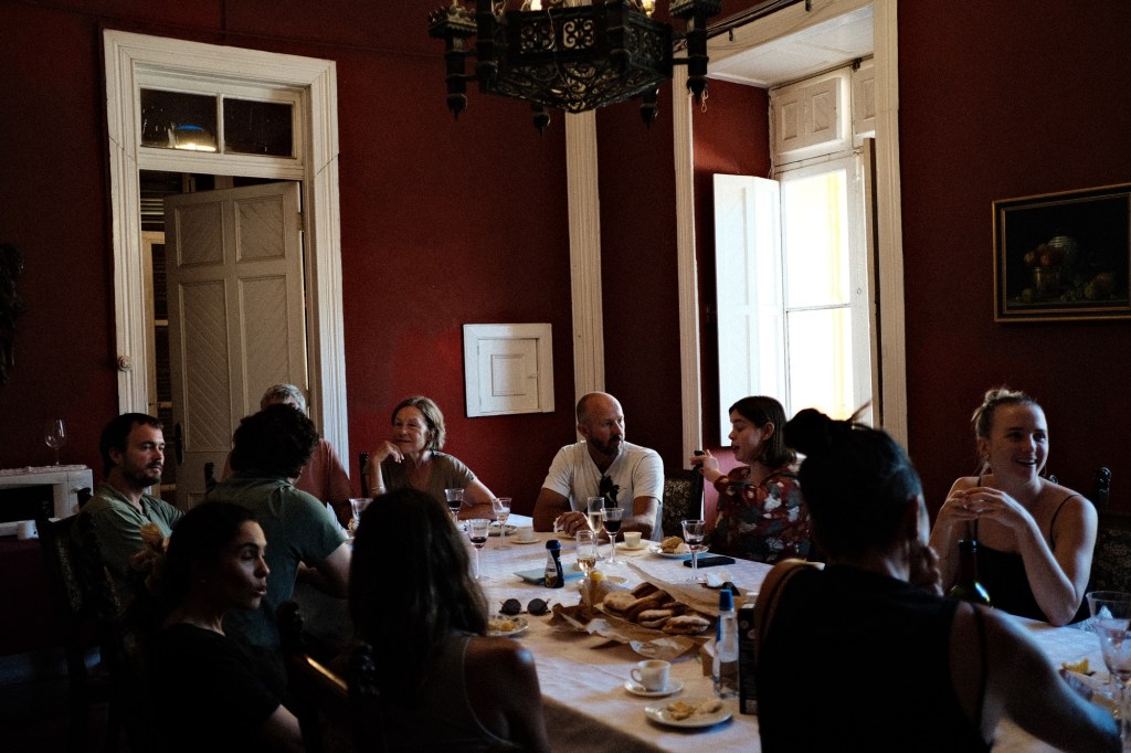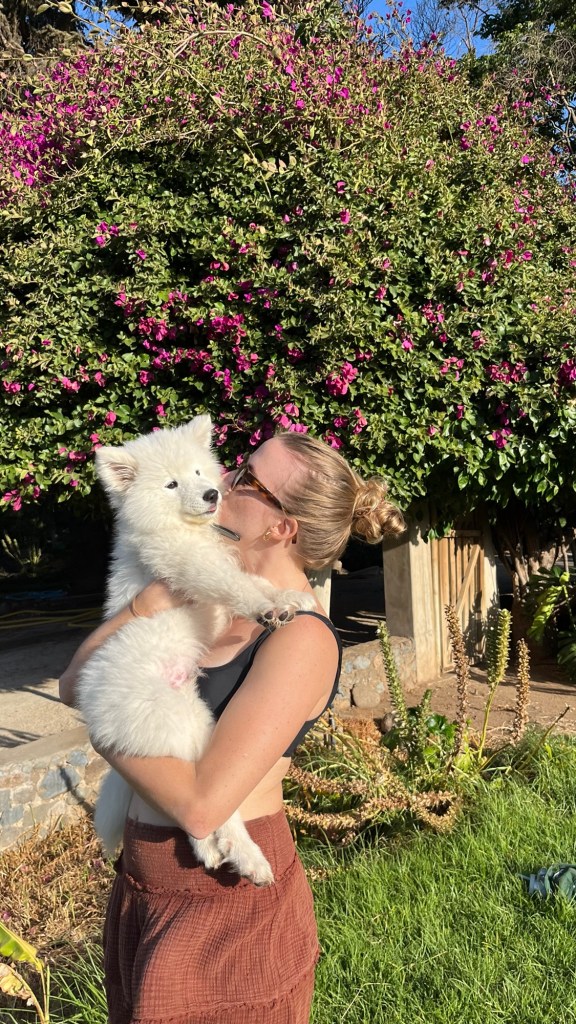 The rest of the weekend passed in a similar fashion: reading a book on the porch, swimming in the pool, lounging in the late afternoon sun — usually with a glass of wine in hand, with someone strumming on one of the many guitars that seemed to appear across the property. Mornings started with breakfast — a toasted English muffin shaped bread called hallulla, topped with butter, eggs, and of course avocado — and fresh squeezed orange juice. Lunches and dinners were more traditional Chilean foods, including charquican, a sausage and vegetable soup that was one of my favorites, and more dulces de La Ligua. Ruro made a pitcher of the best Pisco Sours I have ever had in my life, made with a specific type of lemon grown on the farm (and even better the next day after being frozen overnight). Charlotte and I slowly won over the cats, and the runt of the litter even came all the way over to the washing machines without being scared by us. Hari, the three week old Samoyed puppy, enjoyed his first experience outside of Santiago — getting into fights with the old house cat and finding the coolest patch of grass by the pool. On the last evening we had an aperitivo in the courtyard to celebrate 48 years of marriage for Nacho’s parents. The kids played football in the courtyard, Nacho’s brother-in-law Ben played guitar, and we all chatted and laughed as the cool evening air descended.