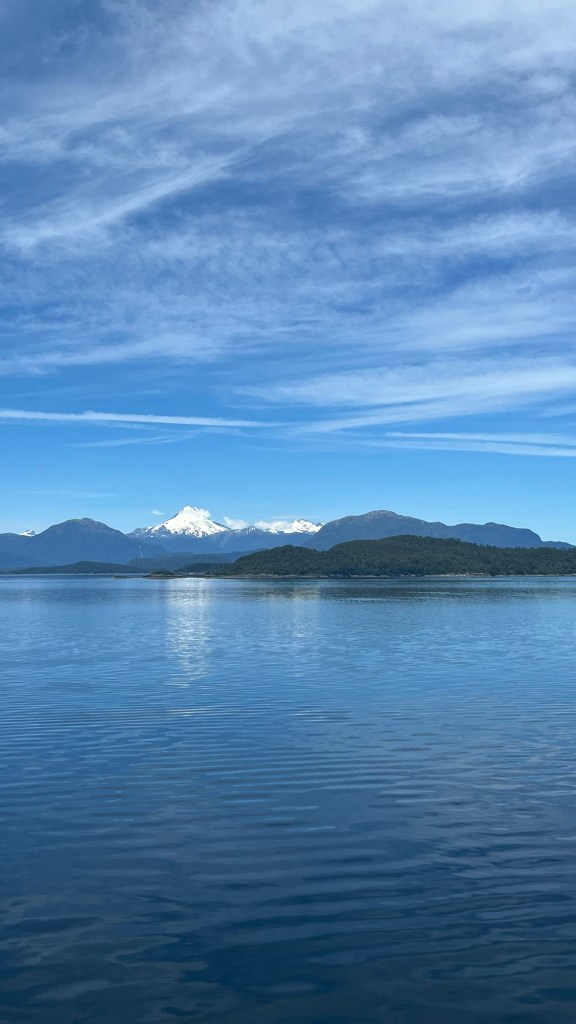 After dinner Lucia, Lukas, and I went to the stern to watch the boat push off. Lucia expected a “Chilean delay” and correctly predicted that we would leave 2 hours behind schedule. As we slowly navigated out of the Puerto Montt harbor, the sunset began painting pink and orange stripes on the sky, spotlighting two snow-covered volcanos on the horizon. The three of us chatted and joked as the sky darkened and we picked up speed, discussing our plans for Puerto Natales (all 3 of us were headed to Torres del Paine, them for the O-trek and I for the W-trek). Inexplicably, Lukas explained that he had brought 3 emergency blankets along for his trek, which had Lucia and I doubled over in laughter (a theme that would emerge for these days) asking how many times he expected to be in life-threatening danger on an 8 day trek. We continued to chug along southward, joined by Kostas from Greece, as stars emerged and the wind picked up. Finally, it was time for bed in anticipation of our first full day at sea.