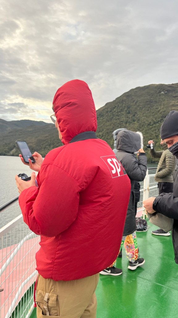 The sun had emerged when we returned to the bow. Suddenly, we were back in sight of civilization. We could see more glaciers and snow capped mountains, but also many cargo boats passing by. Soon we re-entered an area with cell service — I put my phone on airplane mode to stave off the barrage of notifications for a few more hours. Then Lucia, Lukas, Satoshi, and I propped ourselves up on the bow and napped in the strong Southern sun (the ozone layer is particularly thin here…) for the last few hours of the journey.