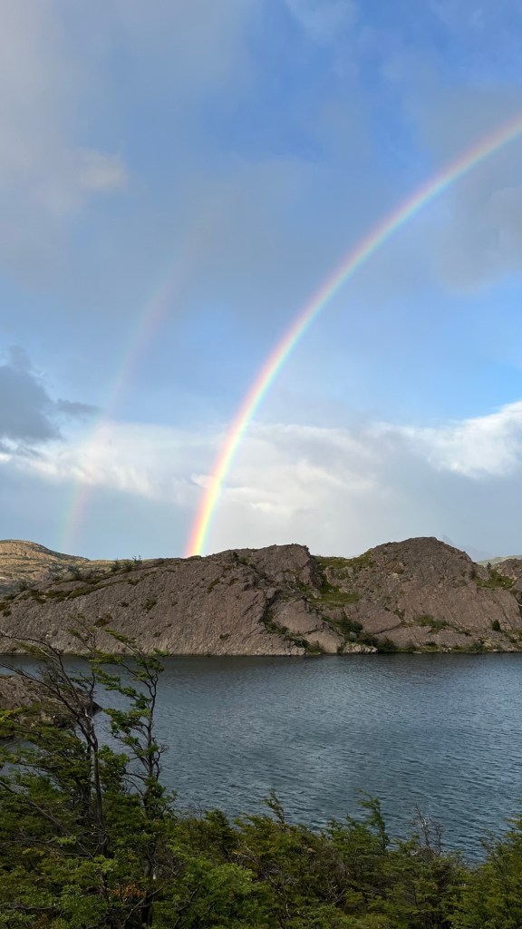 I packed up and headed onwards, and quickly found a small stand of trees by a stream that was protected from the river. still hungry, I sat down there to reassess my breakfast options. I ended up having a handful of pizza, and my last tortilla wrapped around an inch-thick block of cheese. It ain’t pretty, but gets the job done. I followed the trail up a hill — or tried, at least, but the trail markings weren’t always clear and footprints would head off in two different directions. But with some effort I stayed on track, and after a bit more climbing was treated to two more rainbows, these out over Grey lake in the direction of the glacier that I could not yet see. Doubled over in the wind, I almost missed running into two hikers from Kansas City I had met in the Refugio bar back in Cuernos, who had reached the mirador and were headed back to Grey for a ferry. I wished them well and crossed the last few meters to the mirador, which off in the hazy distance offered a view of Grey glacier, icy blue against the dull, well, grey color of the lake. As it turns out the lake and glacier are actually named after the color, not after some aptly-named explorer as I had assumed. However, it was too windy to stay for long to admire, and I could see dark clouds roll in. Time to keep it moving, once again.