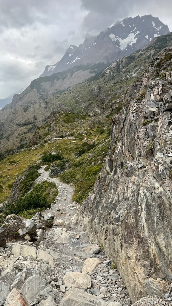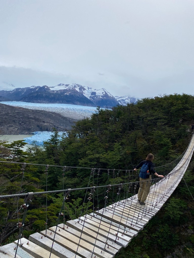 After maybe 30 minutes or so I made it to the second bridge. This one was much closer to the glacier (and I think not too long ago was parallel to the glacier). It was also much longer and more exposed-seeming that the first. To my own surprise, I got to the edge of the bridge and physically could not bring myself to cross it. Nope nope nope nope was the only word my brain could formulate. Okay, fine. I took a deep breath and joined a British couple, Peter and Rosie, who were sitting nearby enjoying the view of the glacier. We chatted for awhile and discovered there was another mirador just after the bridge that promised a better, uncompromised view. Sheepishly, I asked if I could go over the bridge with them as I was a bit scared. Peter was not a fan of heights so I was in good company, and one by one we made our way along the bridge. I know they say don’t look down, but you really have to on this one — to our horror, we discovered a slat was missing right in the middle of the bridge, leaving a hole wide enough for a skinny person to fall into. And, by the way, what happened to the slat? Did it break? Would others? Suffice to say I took a deep breath when I finally got to the other side.