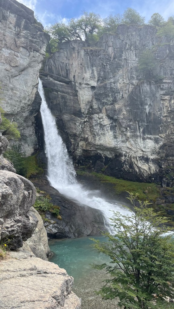 The weather wasn’t great the next few days, so I found myself in a bit of a holding pattern until Lucia’s arrival. Luis arrived on my second day, another welcome friendly face, so the two of us met for coffee in the morning and then walked the short, flat trek to Chorillo del Salto, a large waterfall just outside of town. We stopped for beers and empanadas and live music (in reality, the warm-up sessions for a gig later than night) in a bar at the edge of town. I had a nice dinner — steak again, when in Rome — with the English guys I had met in El Calafate, who taught me an Argentinian card game they’d brought with them. The next day I caught a bus to Lago del Desierto, an hour up-valley from El Chalten. A short hike of under an hour (however, almost straight up a cliff, clinging to ropes) brought me to the Huemul Glacier. I admired the turquoise water and watched the glacier from relatively close, trying to understand the marks of its retreat on the stone below. It started to hail, so I retreated for cover under a large rocky overhand with an Argentinian couple named Felipe and Angi. We chatted for awhile over sandwiches (me) and mate (them), and hiked down together to the lake shores, where I read my book and napped as they had a picnic. All in all, a decent use of a rest day. I passed out in the bus, waking up to find myself in the middle of Chalten again, with messages from Lucia to meet her at a rental shop.