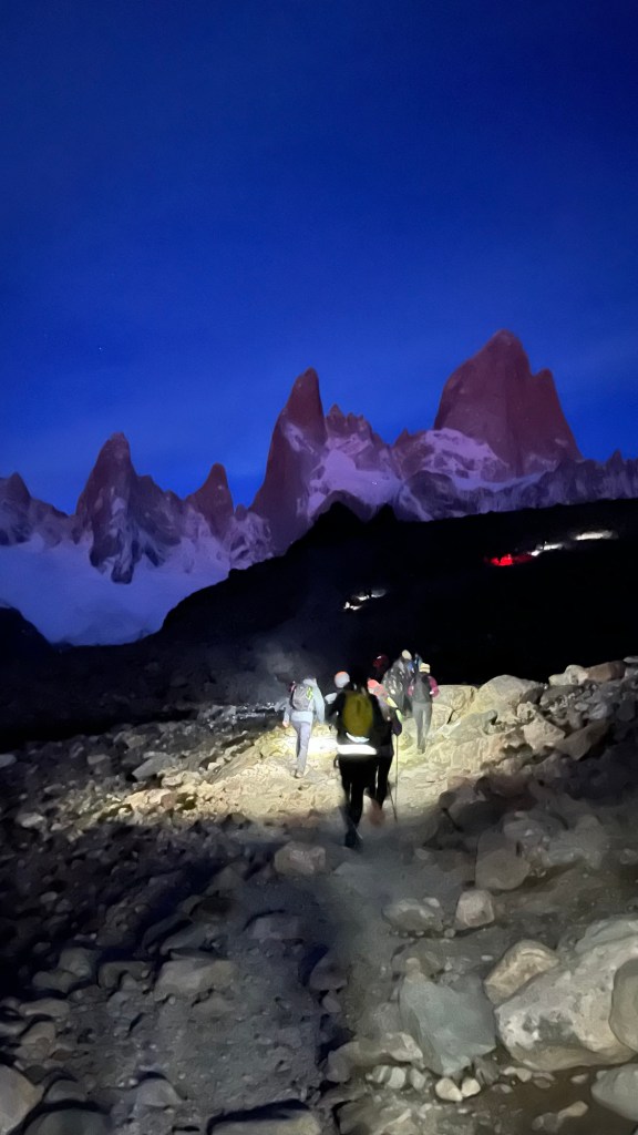 After dinner, as I was headed to the nearby river to collect water, I saw the clouds were starting to clear. I called the others over and a small group of campers began to form, snapping photos of the till-then-elusive Fitz Roy as wisps of pink clouds swirled around its peak. Giddy, our group of four began discussing plans for the next day. My plan had always been to go for sunrise, but this surprise view had convinced the others to come along as well. So, we talked through a packing list and divvied up responsibilities, and agreed to set off at 4:30am. After one more “pot” of tea (consumed straight from the camp stove), we retired as the light finally faded, excited and anxious to wake back up in a few hours.