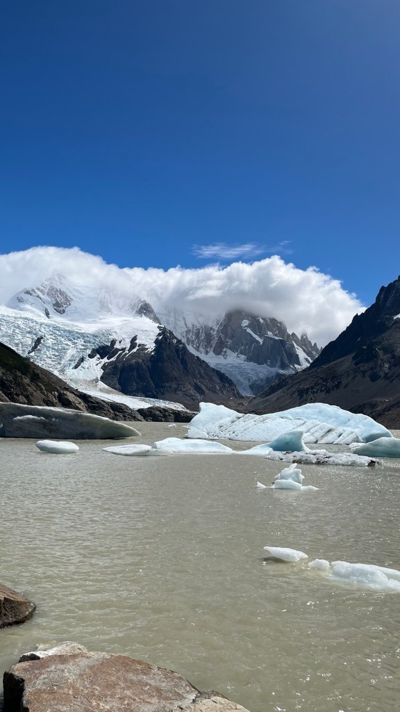 After the unbelievable views at Fitz Roy this morning, to be completely honest Laguna Torre felt like a bit of a letdown. Maybe this was the exhaustion, the pain, or the fact that I couldn’t be bothered to walk back uphill to a slightly more scenic viewpoint. But I arrived in gale-force winds to a soupy grey lake with massive dirt covered icebergs floating by, and the glacier view obscured by rocks. I could barely stand at this point so retreated to a small wind shelter made by previous hikers, grabbed some glacial ice floating near the beach, and laid down in the sun to ice my knee, make lunch, and take a much-deserved nap. By the time I awoke it was already 2:30, meaning I’d been up and moving for 10 hours already. It was time to get back to town. So I bid the lake farewell and headed back to the path.