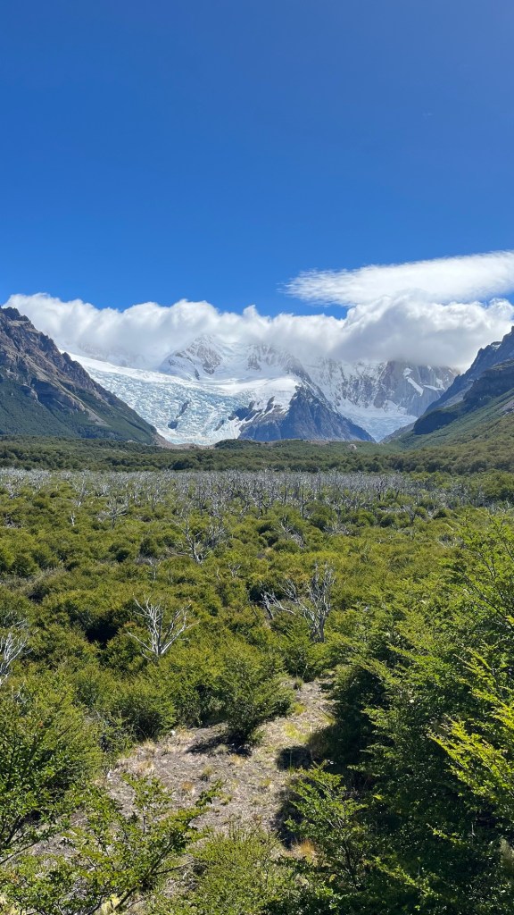 At camp, Lucia and I took down the tent — one of the pegs had inexplicably disappeared in the middle of the night, to our confusion — and packed up the rest of our things. From here we would split up: Josh to check out a nearby glacier, Lucia back to down to take care of her injured knee, me…to add another 20km to the day and see Laguna Torre. [Insert Charles Leclerc “I am stupid” meme here]. Lucia was taking the tent down (I had carried it up) so at least my pack felt lighter than expected. I promised to see them in town for a celebratory dinner and set off, smiling in the now late-morning sun as I ambled alongside a river, Fitz Roy still visible to my right over a grassy field. I headed out along the Laguna Madre e Hija trail, listening to music and enjoying that the walk was basically flat. To my left, the two lakes (warmer, so not that glacier blue) rippled in the breeze and reflected the mountains and glaciers beyond. Past the lakes I walked through fields and a forest, passing only a few hikers — including one who asked to see my photos from the sunrise this morning, and showed me the photos he took of Fitz Roy from town. As I started along a downhill forested section I could feel my knees starting to give out. But it was too late now to turn back so I trudged onward. Eventually the trees opened up to a fantastic view up valley to two massive glaciers perched high on snow covered mountains, over a green sea of trees. I stopped for a break to enjoy the view before making the final push to Laguna Torre.
