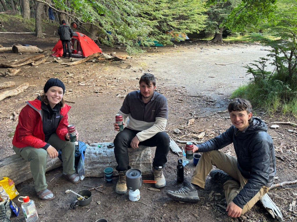 We finally reached the viewpoint to find that the clouds had not opened up. Even so, we could see the edges of the mountains through the wisps of clouds. I climbed up a rock over to the left of the viewpoint and found myself overlooking the deep turquoise and ironically named Laguna Sucia (dirty lake). The color of these glacial lakes never fails to impress me. I called up Lucia and Josh, and we were joined by Gaelen, an 18-year-old Canadian wildlife firefighter (and expert birder) who had pitched a tent near ours. Josh snapped photos on his film camera (a much more impressive one than my point-and-shoot), and we hung around for awhile waiting to see if the weather would change. Eventually it became clear this was not going to happen, and we were getting hungry, so the four of us made our way back down quickly to camp. We invited Gaelen to join us for beers while we made dinner: an entire 500g bag of pasta cooked in soup from a soup packet (a key learning from my TdP days), and some grated cheese. A backcountry cacio e pepe, if you will. It was probably terrible but in that moment was delicious, and the three of us scarfed it down straight from the pot while Gaelen ate his dehydrated bolognese and looked on, bemused.