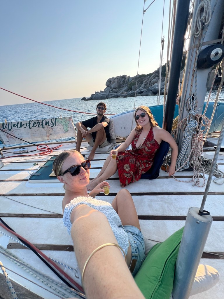The next day we had breakfast and then set sail towards Capo Boi, a beach recommended by the Italians the night before. We anchored on the way there near a cliff and spent the afternoon snorkeling, paddle boarding, and napping. It was heaven. Our anchorage for the night was tough, and I watched, impressed, and Charlotte and Nacho navigated it smoothly. We celebrated with another snorkel — this time we saw lots of electric blue fish and even a manta ray. We also were anchored next to an underwater statue of Jesus, which Charlotte dove all the way down to. I investigated from a few meters above, as I never was great at diving deep — my ears hurt! After a quick sailor’s shower (i.e., lathering up and diving back in the water), Charlotte and I sat on deck and watched as a very attractive spear fisherman in the boat over pulled up anchor and set sail. Even Nacho had to admit that the guy’s washboard abs were impressive, and his boat was very nice. After a lovely aperitivo on board we motored to the beach for dinner (lobster pasta!) and sunset. I opted to sleep on deck, which is always my preference. I fell asleep listening to Cat Stevens, watching the stars, and being gently rocked back and forth by the boat.