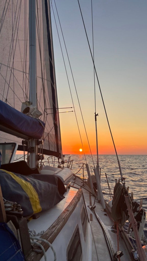 Dinner the first night was fried rice. The three of us sat on the bow, enjoying the late evening sun. As dusk started to fall we retreated back to make preparations for the evening — I would be subbing in on night shifts tonight, which I was excited and nervous for. After yet another brilliant, blazing sunset, we were treated to one of the most insane moonrises I have seen. The moon was bright orange, so much that it looked almost like the setting sun. It hung, massive, just over the horizon, its reflection leaving a shimmering trail behind us. Ahead of us, we sailed into the deep red of the still-glowing horizon. A smattering of the brightest stars started to emerge in the night sky above us, now the same deep blue that the water had been midday.