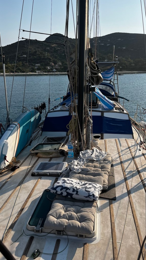 “So, Nacho is going to have to dive under the boat to check it out,” she continued. So we floated, bobbing back and forth in the waves, not really making any progress. We were hours from land — Sardinia was by this point the closest point. Lit only by the light of the moon, we watched nervously as Nacho put on flippers and a headlamp and prepared for his midnight maintenance dive. I had already been impressed by how Nacho and Charlotte had taken on the upkeep of this boat themselves — it requires a whole new set of skills and expertise that I struggle to even comprehend. (What do you mean you fixed an engine yourself, with your own two hands?). Holding my breath as Nacho dove into the dark depths, I was even more amazed and inspired by what they are doing by living on this boat full-time. All that to say that when Nacho returned on board unscathed and the motor began running smoothly, I was relieved and immediately allowed myself to be rocked to sleep until my 3am watch.